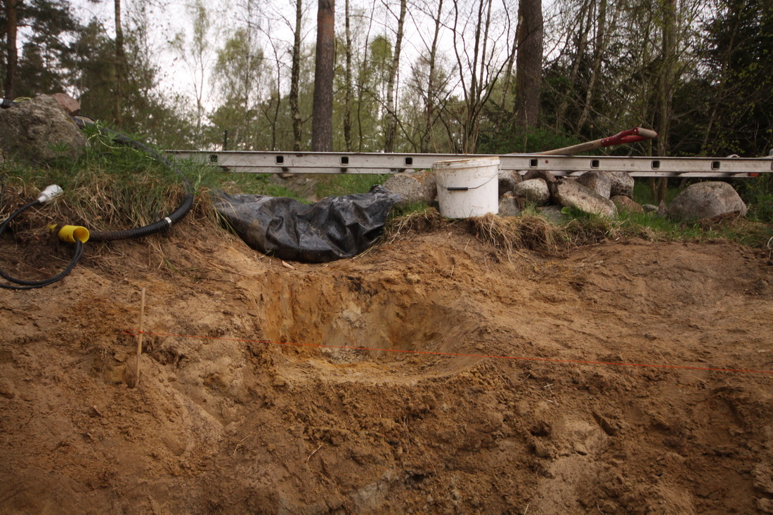 Det har stått stilla i mer än en vecka nu med dammbygget, i första hand på grund av att vi transporterat hem totalt 60 kvm marksten. Men idag fick jag upp resterande bottenslam plus vad som återstod av den gamla dammduken. Så nu kan vi äntligen komma igång och bygga. Har börjat gräva ut för vattenfallet. Sen började det regna!