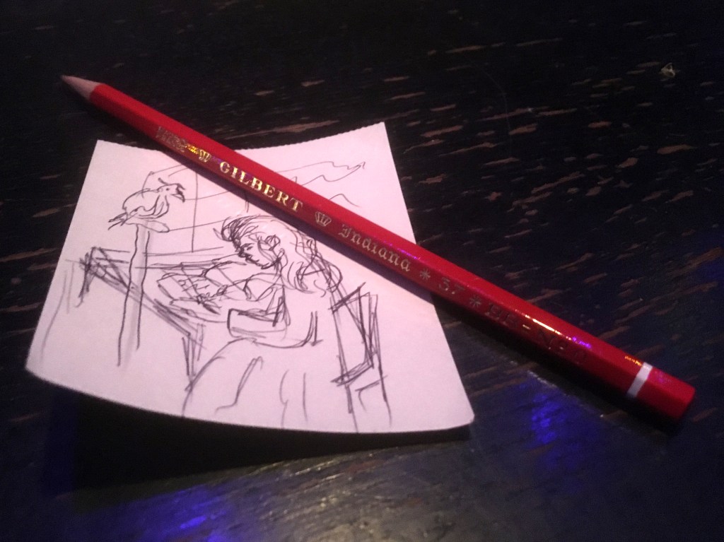 Av någon anledning handlar våra samtal vid fika- eller matbordet väldigt ofta om skrivande. Eller andra frågor som på ett eller annat vis är relaterade till skrivandet. En hel del kreativitet har flödat vid dessa samtal, och många goda idéer har kommit till. Senaste var en diskussiom om omslaget till Regntider, min tredje del i serien Legender från Thiramaar. Jag har skapat en enkel variant som förslag till den, som jag har offentliggjort tidigare. Nu diskuterade vi lite hit och dit och kom fram till att det kanske på sätt och vis är lite för dystert. Den idé vi fastnade för nu är baserad på det inledande kapitlet i boken, som börjar hos kaldiniernas andliga övermagiker Ambarand! Say no more … Snezana gjorde en första skiss!