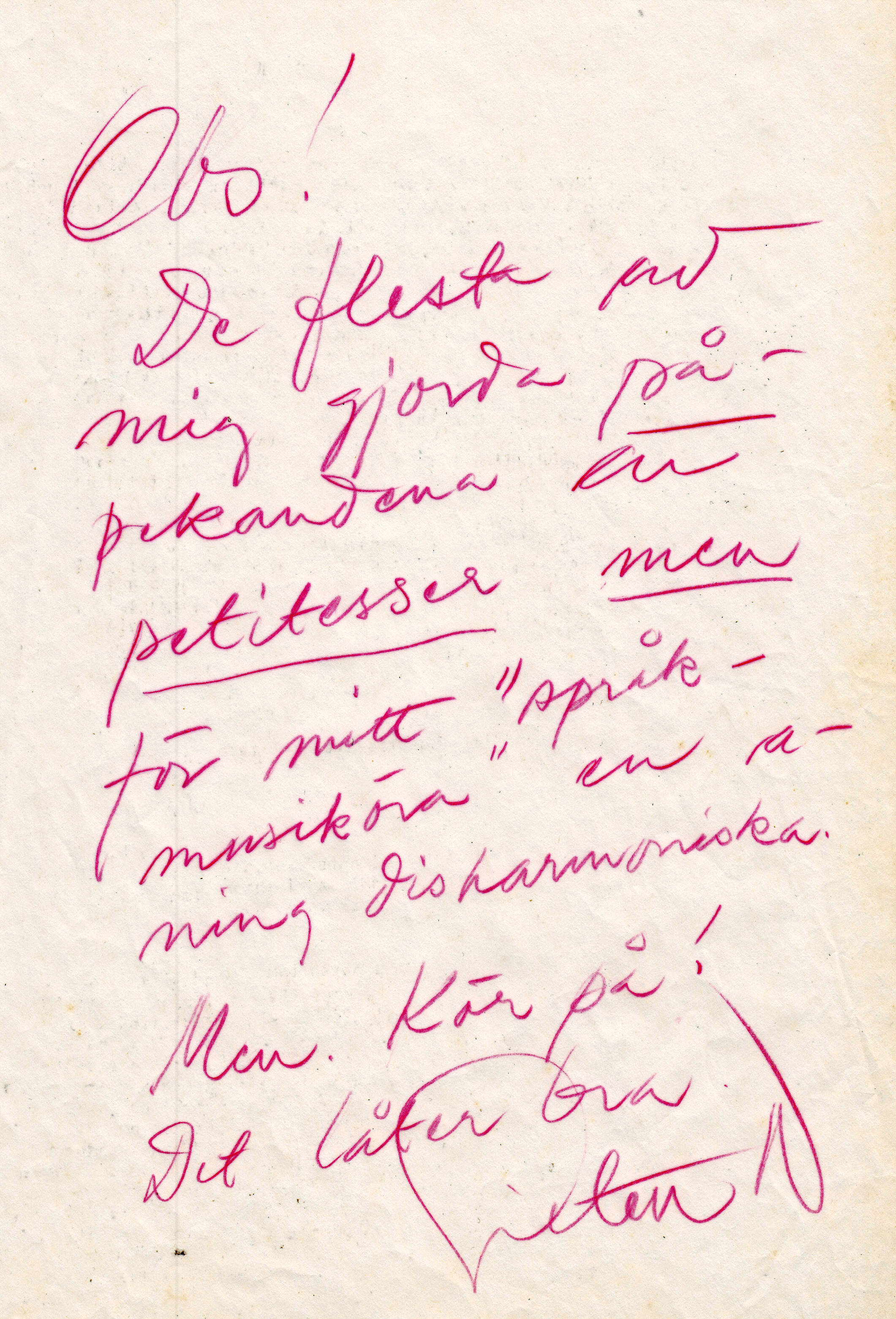”Hej, det är Sixten. Nu har jag äntligen fått lite lugnt omkring mig, och jag ska börja läsa ditt manus. Jag tar en whisky, och återkommer.”