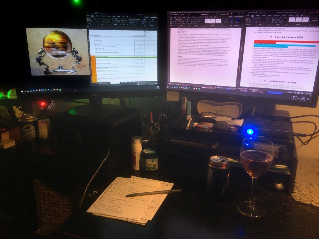 Fredag kväll igen! Och jag ska inte jobba i morgon … eller, nä just det … det gör jag ju inte längre. Fast på sätt och vis gör jag ju ändå det! Fast numer jobbar jag helt och hållet med det jag verkligen VILL jobba med! Det är därför det ser ut som det gör på bilden just nu. Jag skriver! Och kärleken arbetar f n med en boktrailer åt en kund.