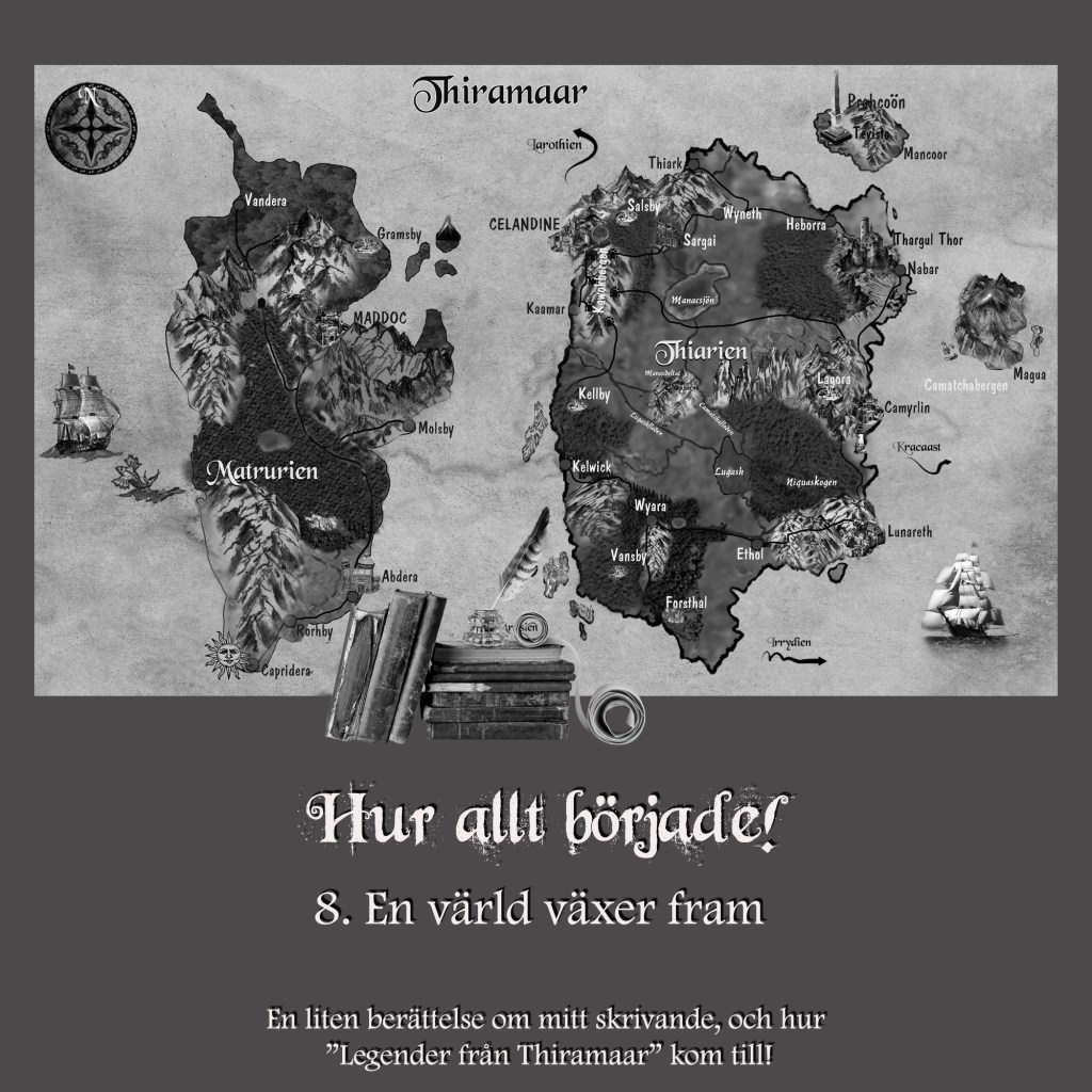 När det allra första kapitlet påbörjades fanns världen Thiramaar mest i tankarna. Det var dessutom inte ens en ”värld”. Det handlade inledningsvis enbart om ett land – Thiarien. Men redan innan första kapitlet var skrivet, hade jag insett att en karta var nödvändig. Helt enkelt eftersom Gudarnas spira, som egentligen var den bok jag började med, kretsar kring Andor, Kintara, Tobin & Samus resa runt i hela landet. Så jag ritade upp en godtyckligt formad landyta med enkla pennstreck, och markerade sedan inledningsvis byn Forsthal, där den berättelsen tar sin början. Därefter har orter, skogar, sjöar, berg och så vidare växt fram allt eftersom berättelsen krävt det. Grannlandet Matrurien nämns vid några tillfällen i Gudarnas spira, men det blev först när jag började skriva Eilaths hopp som behovet kom att faktiskt även rita in Matrurien på kartan eftersom en stor del av den bokens handling utspelar sig där. På samma vis har Maguaön kommit till på kartan när Regntider växte fram. Likaså när jag nu skriver på den fjärde boken som ännu så länge kort och gott har Ashas sten som arbetsnamn, finns det eventuellt behov av att även få med grannlandet Irrydien.