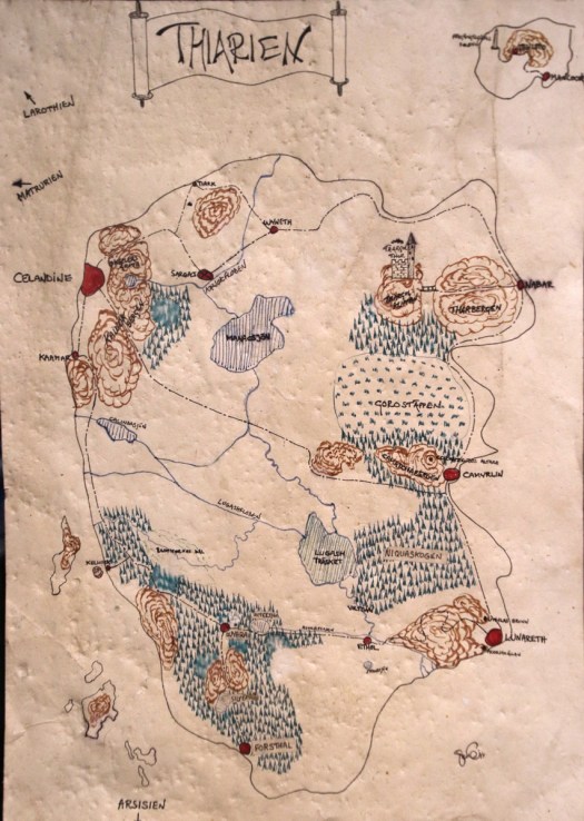 Redan från första början när jag började skriva på mina berättelser till Legender från Thiramaar, insåg jag att en karta var en nödvändighet. Gudarnas spira, som egentligen var den första boken jag skrev, handlar ju om att huvudkaraktärerna gör en resa runt i princip hela landet Thiarien. Det skulle vara praktiskt taget omöjligt att hålla ihop den berättelsen utan en karta. Med utgångspunkt från Forsthal, där huvudkaraktärerna Andor och Tobin kommer ifrån, började jag rita kartan. Den har sedan byggts på allt eftersom berättelserna växt fram. Den här kartan är den ursprungliga, som sedan legat till grund för den kartan som publicerats i böckerna, och som även finns i färg och hög upplösning här på hemsidan. (Karta i färg)