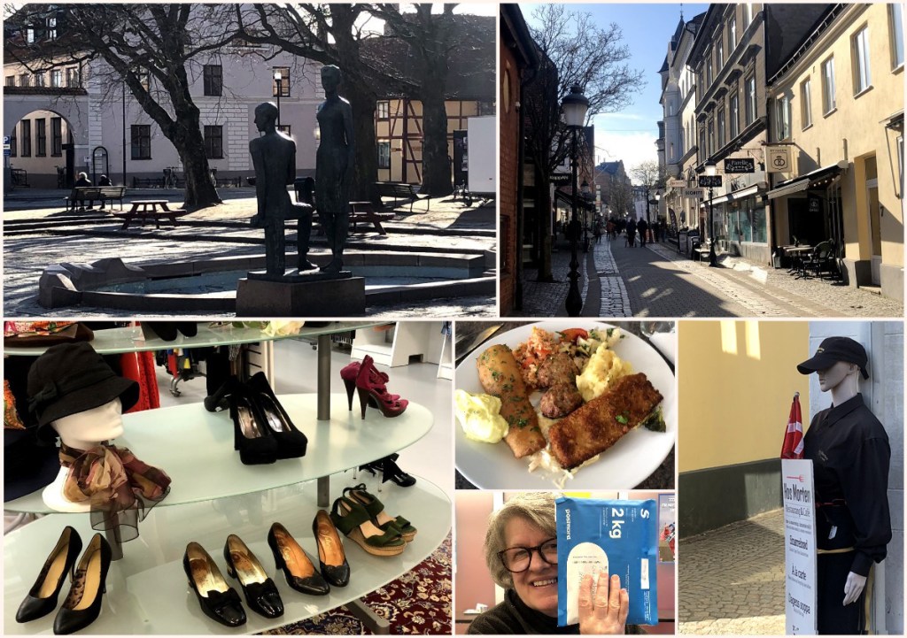 Det här blev nästan en heldag. Vi började med en ljuvligt god och synnerligen prisvärd lunchbuffé på Restaurang Gondolen i Sjöbo! Det är fräscht, rikligt och fantastiskt gott. Värt varenda krona! Efter detta körde vi till Ystad, där vi valde att parkera vid Willys, för att kunna få tillfälle att ”gå ner maten”. Promenerade därifrån i solskenet in till gågatan i centrum, dit vi skulle för att shoppa lite nya kläder. Promenad tillbaka till Willys där vi dessutom slank in i den stora Öppna Hjärtat Second hand.