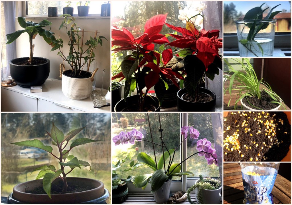 Med hårda stormvindar som slet omkring oss, stod vi i lugnet på altanen idag och planterade. Det var tomat- och paprika-plantor uppdrivna från fröer direkt från grönsakerna, som vi tagit vara på. Återstår att se nu om de fortsätter att växa, och kanske rentav kan ge oss lite extra grönsakstillskott i sommar. Öste dessutom ner en hel påse hela majskorn (alltså opoppade popcorn om man så vill) i fyra stora krukor. Det blir väldigt dekorativt ”gräs” på altanen i sommar. Inomhus pågår också diverse så kallade odlingar. Bland annat har vi ju nu flera lyckade plantor från julstjärna, och de två vi köpte hos Granngården i början av december förra året, är fortfarande lika praktfulla. Sen ser det ut som att vi äntligen lyckats få rötter på några Benjaminsticklingar. Vi har två förskrämda plantor sen gammalt, som aldrig tycks riktigt hämta sig, sen vi fick spinn på dem. Har i omgångar försökt driva upp sticklingar från dem, utan att lyckas. Men nu ser det alltså ut att ändå fungera.