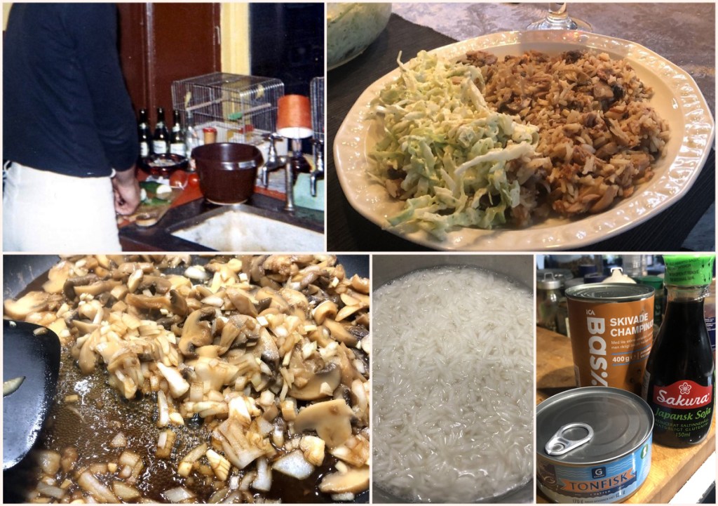 Dagens måltid var nostalgisk, och inspirerad av mitt skrivande. I mitten av sjuttiotalet var det här en av våra vanliga måltider när jag och mina båda kompisar Emma och Hans-Olle (det var så jag kallade dem i Idag kan det kvitta) fixade våra lördagsmiddagar tillsammans. Perfekt anpassat till vår begränsade budget, och samtidigt ändå i all sin enkelhet väldigt gott. Tonfiskris! En maträtt som dessutom självklart kommer fram i min delvis självbiografiska roman Kalla mig Anna som jag arbetar för fullt med just nu. Som sagt – väldigt enkel mat! Tonfisk, champinjoner, lök, vitlök, rostad lök, japansk soja, cevapcicikrydda och ris. Ur Kalla mig Anna; Det var lördag när de som vanligt satt vid Jannes blodröda matbord i köket. ”Som vanligt så jävla gott”, sa Robban och torkade sig med servetten runt munnen. ”Tonfiskris”, svarade Janne. ”Världens enklaste maträtt.” ”Enkelt om man kan sånt ja.” ”Det är bara lite ris som du blandar ner med tonfisk, svamp, skivade tomater och kanske lite lök i stekjärnet. Lite soya på det. Ja, just det … en halv flaska lättöl också. Sen är det klart.” ”Är det allt? Det är väldigt gott.”
