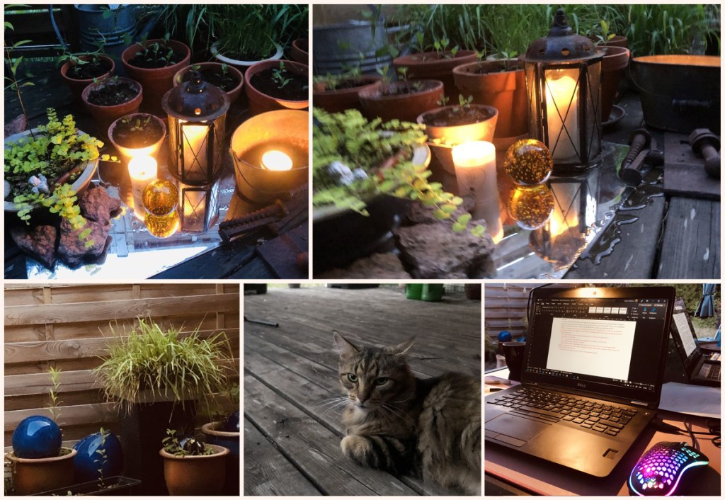 En stillsam njutningsfull kväll på altanen i sällskap med kärleken, katten och laptoppen. Försöker skriva vidare på min roman ”Kalla mig Anna”, som jag hyser en svag förhoppning om att snart kunna bli klar, med åtminstone den här vändan. Behöver förmodligen korras ett par varv till.