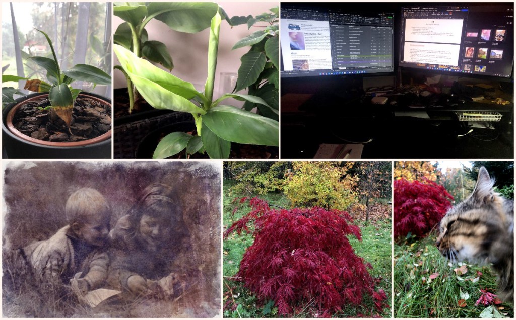 Under eftermiddagen blev det ett länge emotsett återseende. Tiden går fort, men med åren rör vi oss kanske inte fullt lika fort själva. Så då får man försöka hålla in tiden lite och bara sitta ner och fika och samtala en stund. För övrigt konstaterar vi att vi numera tycks vara ”självförsörjande” även på bananplantor. En banan jag planterade om i slutet av augusti, hade redan blivit för stor och behövde ny kruka. Och just nu är vår trädgård en ovanligt färgstark palett, och Mogwai trivs i fokus.