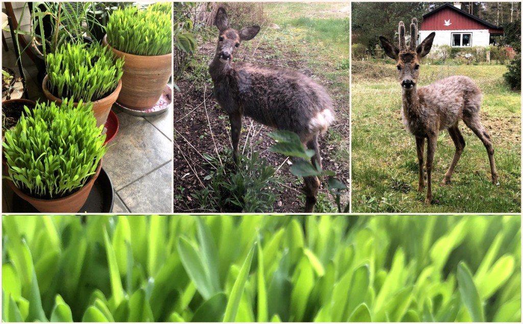 Popcornsgräset är redo för altanen! Så nu väntar vi bara på värmen! Det gör nog våra återkommande gäster också, nu när de håller på att lägga av sig vinterpälsen. Det är onekligen en lite speciell känsla att sitta sådär knappt två meter ifrån dem och fotografera med mobilen. Livet i skogen!