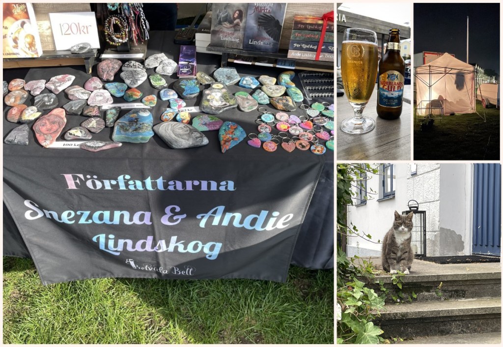 För övrigt blir våra marknadsdagar lite som kombinerad försäljningstillfälle och lite … tja, minisemester, sen vi skaffade nytt tält. Vi ankom till Kiviks hamn i fredags eftermiddags, och kunde sätta upp våra grejer i lugn och ro. När det var klart njöt vi av goda räk- och laxdelikatesser från Buhres på Kivik, och ett helt underbart bröd med valnötter och tranbär, vid vårt bord i tältet.