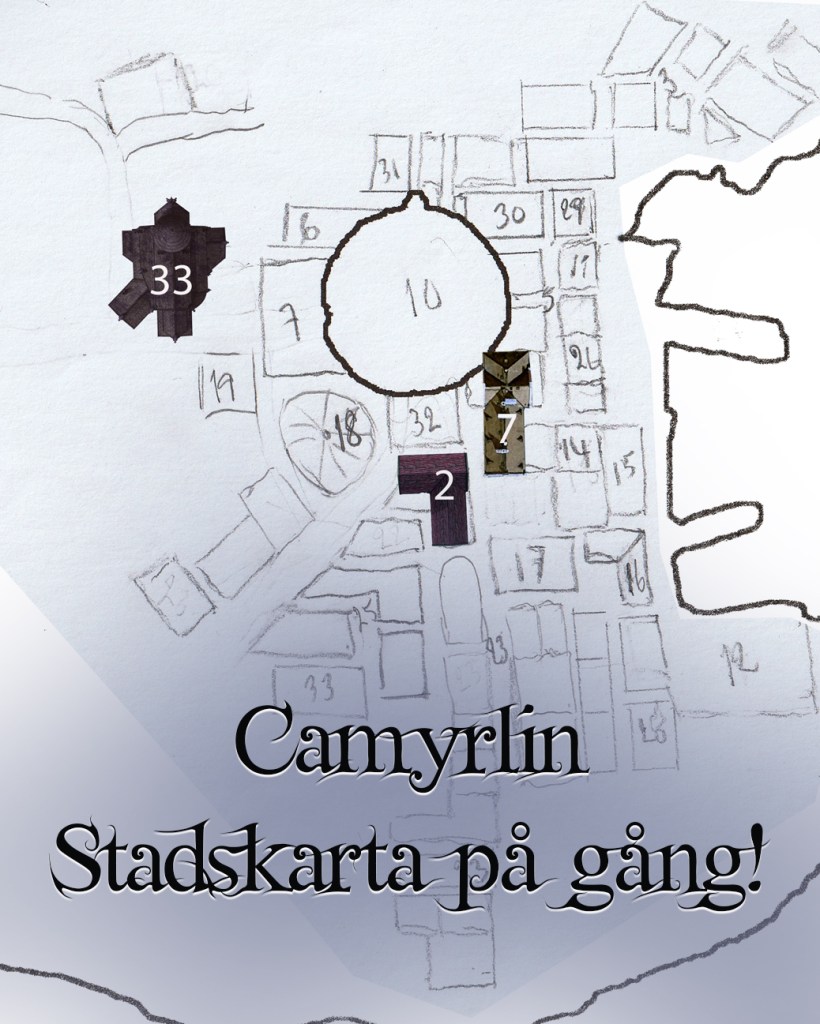 Nu börjar det långsamt likna något. Den grundläggande skissen är klar, och skannad och inlagd i Photoshop. Nu ska alla byggnader, gator och torg placeras. Först alla hittills namngivna platser. Därefter ska hela resten av stans bebyggelse och gator fyllas på. Än återstår en hel del, men bara att ha fått klart skissen med alla nämnda platser inlagda, känns som ett stort framsteg. Det blir ju lite mer komplicerat när det finns fyra romaner där olika platser finns omnämnda. Hade varit enklare att skapa stadskartan innan första boken skrevs. Men där är vi alltså inte.