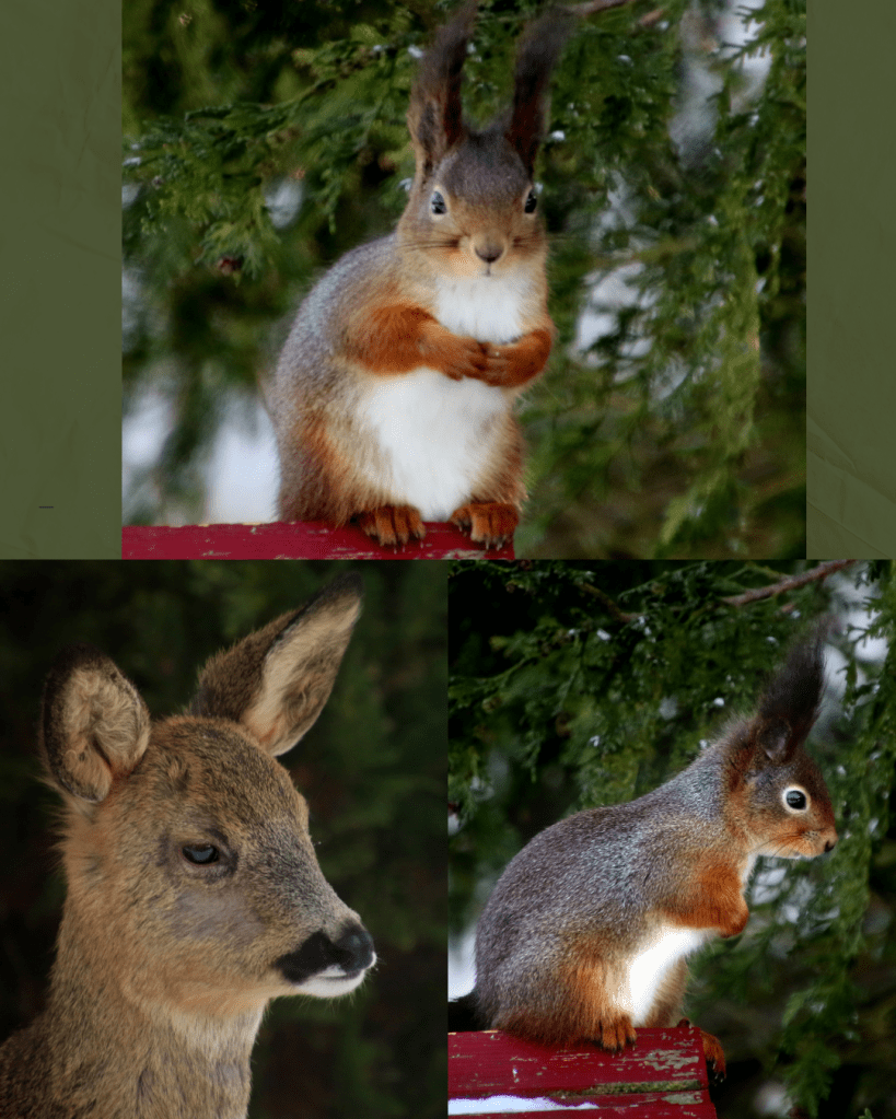 Vi kan glädjas åt många gäster i restaurangen. De sedvanliga fåglarna, talgoxen, pilfink och blåmes, men även en och annan domherre, gulsparv och grönfink och en hel drös bergfink. En och annan duva och till och med fasan syns här emellanåt. Men de gäster som kanske jag uppskattar allra mest, är två synnerligen välmående ekorrar. Givetvis också ”våra” rådjur, som dök upp igen idag. Blev dock lite fundersam, då det enbart var den vuxna honan och ett av kiden. Får mig genast och undra om det har hänt det andra kidet något. Det är också lite märkligt att honan fortfarande tydligen inte har stött bort ungarna.