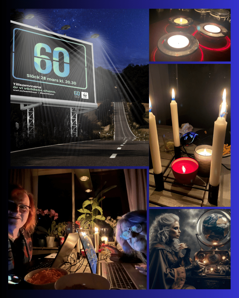 I fjorton år har vi följt den här traditionen, och uppmärksammat Earth Hour, och släckt ner allt elektriskt ljus. Vi parkerar oss i uterummet med våra laptops – som förvisso kör på batteri – men all belysning består av stearinljus. Och faktum är att luftvärmepumparna tycks förstå vad det handlar om, för de tog också självmant en paus, då de stod stilla under den här timmen.