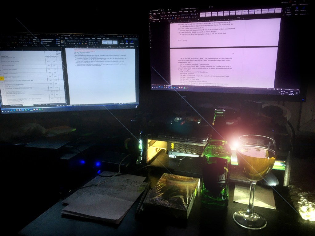 Skrivandet då? Tja, det är ju inget ovanligt egentligen. Skrivandet upptar större delen av min tid. För närvarande är det två manus som är högaktuella. En novell som ursprungligen kallats ”Förlorad” är i det närmaste färdigställd. Samtidigt är det en sista genomläsning av ”Regntider” som gäller innan den ska skickas till testläsare. Just den delen är oerhört spännande, eftersom det blir första gången någon ”utomstående” ska läsa och tycka till!