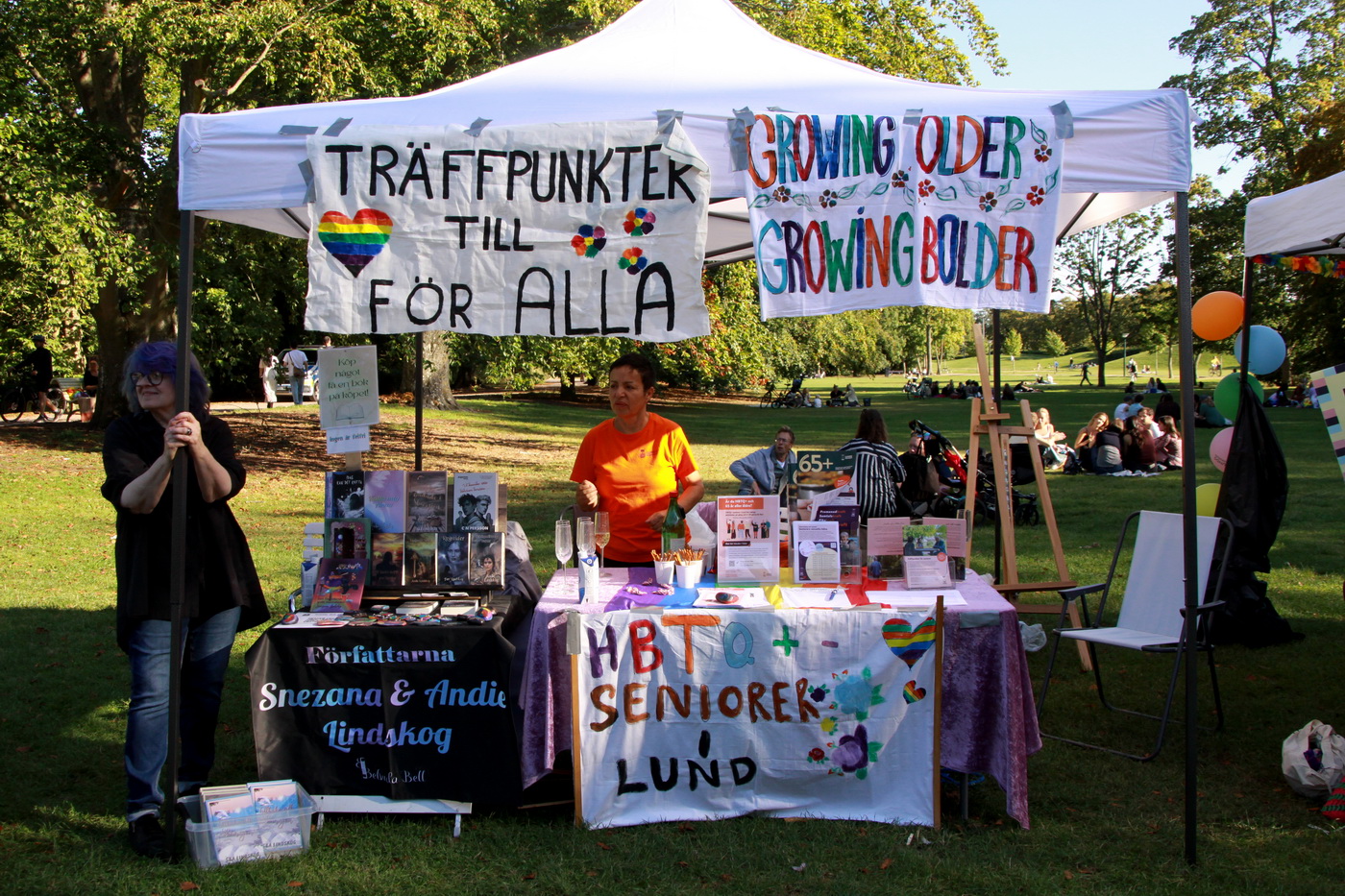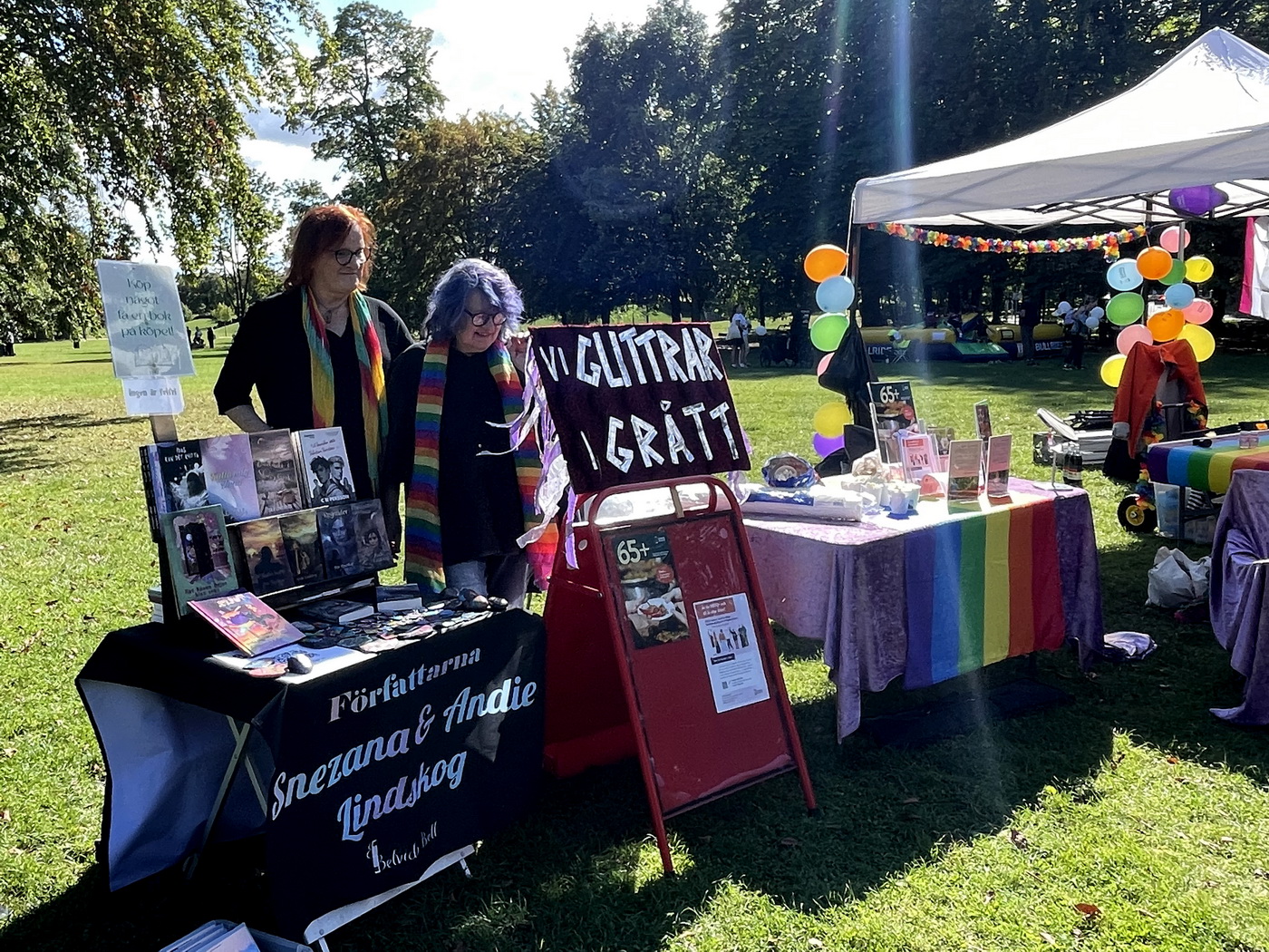 Idag deltog vi i Lunda Pride, med bokförsäljning inbjudna av HBTQ+ seniorer i Lund. Och känslorna kring alla sådana här arrangemang är personligt så starka! Pride är viktigt, och särskilt viktigt idag med allt skit som sker i vår omvärld. Pride är så mycket innerlig glädje och frihet – frihet att få vara precis den man vill vara. Och alla människor man möter i dessa sammanhang är så otroligt genuint trevliga och vänliga. Under bara några timmar i Lunds Stadspark har vi mött en färgstark skara människor – allt från aktiva inom Lunds kommuns nätverk för HBTQ-seniorer till sopransångare och tenorsångare från Ukraina.
