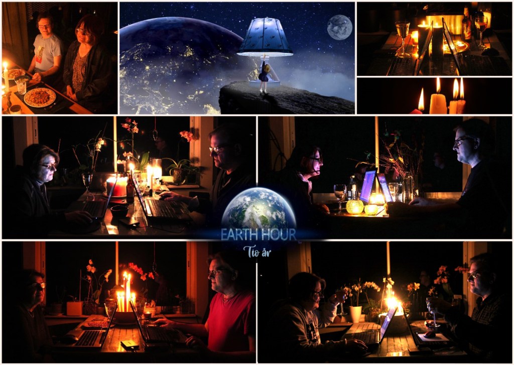 Idag har vi deltagit i den årliga miljömanifestationen Earth Hour, som genomförs varje år för att skicka en tydlig signal till all världens politiker att agera för oss och vår planet. För vår del var detta det tionde deltagandet, som vi genomför på vårt sätt. Vi släcker allt ljus i hela huset, och parkerar i vårt uterum med våra laptops (som laddats tidigare). Sen sitter vi där och skriver eller skapar bilder så länge batterierna i våra datorer varar. I år blev det två timmar och en kvart.
