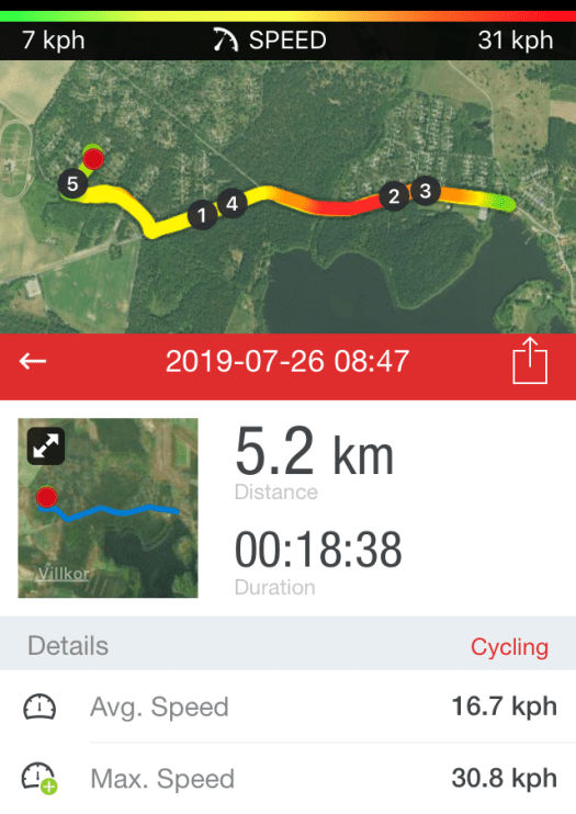 Med morgonens cykeltur har jag kört dagligen i två veckor, och hoppas på att fortsätta så. Den här turen blev dessutom till ett litet personligt hastighetsrekord. Turen gick som vanligt till Sövdesjön och tillbaka, och på återvägen kom jag upp i 31 km/h! När jag sen kollade lite närmare kan jag konstatera att det här rekordet bara gäller under de här två veckorna. Högsta hastighet jag någonsin uppnått var i augusti när jag nyligen hade köpt min cykel. I nerförsbacken i det som numera heter Tullesboallén på väg hem i Öved, kom jag upp i hela 50,6 km/h. Men det var som sagt i nerförsbacke, medvind och dessutom regn!