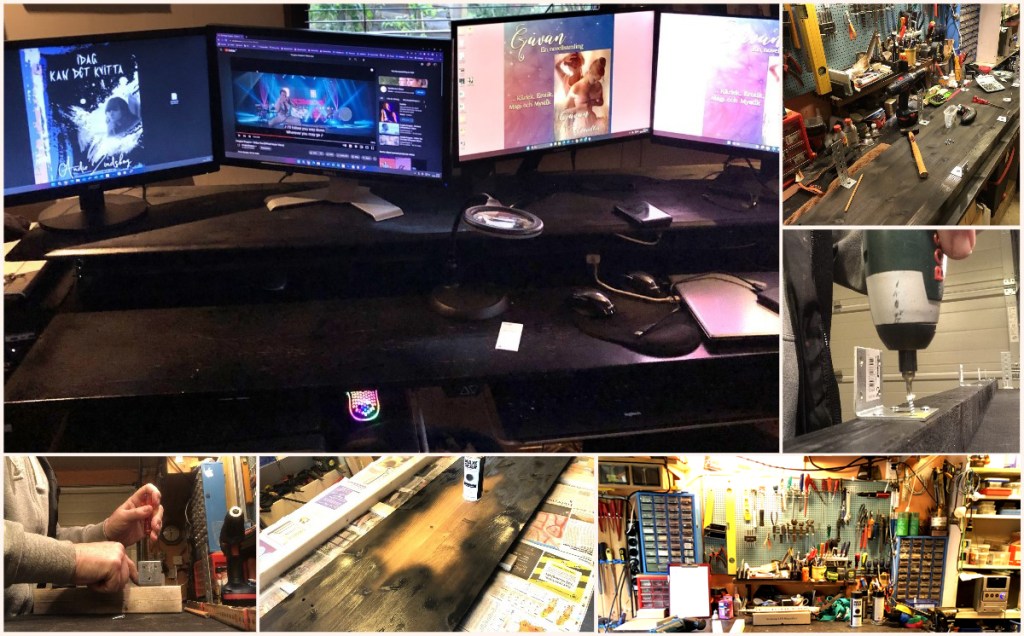 Kan med viss stolthet konstatera att vårt gamla skrivbord fått nytt liv – igen! Då mitt skrivbord byttes ut på mitt dåvarande arbete på Skanska i Malmö, fick jag köpa det gamla möblemanget för en billig peng. Det har sedan hängt med. För många år sedan plockade jag av benställningen till ett avlastningsbord, som hörde till möblemanget. Den bordsskivan har jag sedan många år tillbaka som arbetsbänk i verkstan. Så småningom gick skrivbordet samma öde till mötes. Vi köpte benställning på Ikea för kanske tio år sedan, och monterade skivan på, och dessutom skruvade vi på utdragsskivor för tangentbord. Förra året bytte vi benställningen mot en höj- och sänkbar istället. Nu har jag dessutom monterat ett hyllplan längs hela skrivbordets längd, för att få plats med fyra datorskärmar. Till hyllplanet har jag använt ovandelen av en gammal köpmansdisk.